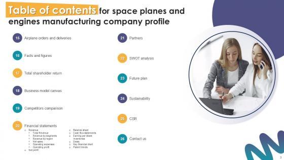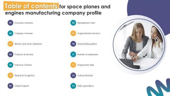Get a simple yet stunning designed Table Of Contents For Space Planes And Engines Manufacturing Company Profile PPT Slide CP SS V. It is the best one to establish the tone in your meetings. It is an excellent way to make your presentations highly effective. So, download this PPT today from Slidegeeks and see the positive impacts. Our easy-to-edit Table Of Contents For Space Planes And Engines Manufacturing Company Profile PPT Slide CP SS V can be your go-to option for all upcoming conferences and meetings. So, what are you waiting for Grab this template today. Our Table Of Contents For Space Planes And Engines Manufacturing Company Profile PPT Slide CP SS V are topically designed to provide an attractive backdrop to any subject. Use them to look like a presentation pro.