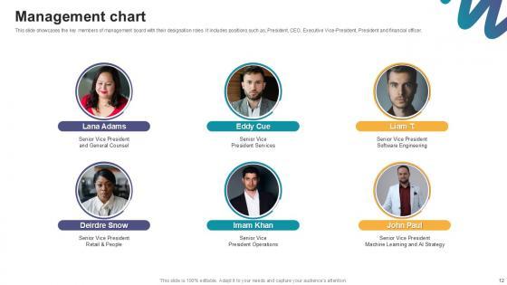 This slide showcases the key members of management board with their designation roles. It depicts CEO, CFO, Founder, VP business planning, Joint managing director, CIO and Head of AI innovation. Formulating a presentation can take up a lot of effort and time, so the content and message should always be the primary focus. The visuals of the PowerPoint can enhance the presenters message, so our Management Chart Vehicle Manufacturer Company Profile PPT PowerPoint CP SS V was created to help save time. Instead of worrying about the design, the presenter can concentrate on the message while our designers work on creating the ideal templates for whatever situation is needed. Slidegeeks has experts for everything from amazing designs to valuable content, we have put everything into Management Chart Vehicle Manufacturer Company Profile PPT PowerPoint CP SS V This slide showcases the key members of management board with their designation roles. It depicts CEO, CFO, Founder, VP business planning, Joint managing director, CIO and Head of AI innovation.