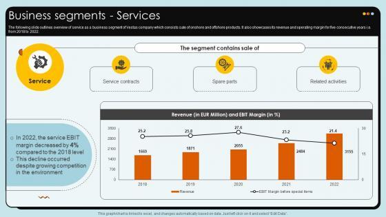 The following slide outlines overview of service as a business segment of Vestas company which consists sale of onshore and offshore products. It also showcases its revenue and operating margin for five consecutive years i.e. from 2018 to 2022.Slidegeeks is one of the best resources for PowerPoint templates. You can download easily and regulate Business Segments Services Wind Turbines Manufacturer Company Profile CP SS V for your personal presentations from our wonderful collection. A few clicks is all it takes to discover and get the most relevant and appropriate templates. Use our Templates to add a unique zing and appeal to your presentation and meetings. All the slides are easy to edit and you can use them even for advertisement purposes. The following slide outlines overview of service as a business segment of Vestas company which consists sale of onshore and offshore products. It also showcases its revenue and operating margin for five consecutive years i.e. from 2018 to 2022.