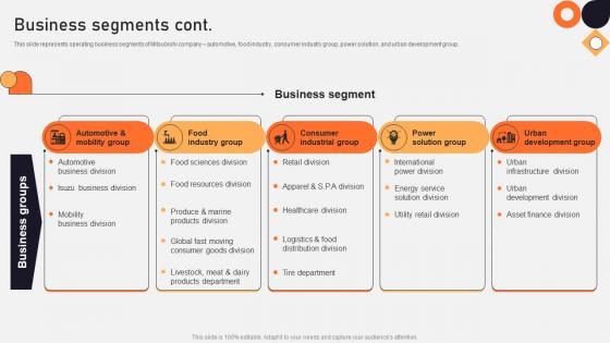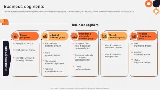 This slide represents operating business segments of Mitsubishi company natural gas group, industrial materials group, petroleum, chemical, mineral resources and industrial infrastructure group.Create an editable Business Segments Vehicle Manufacturing Company Profile CP SS V that communicates your idea and engages your audience. Whether you are presenting a business or an educational presentation, pre-designed presentation templates help save time. Business Segments Vehicle Manufacturing Company Profile CP SS V is highly customizable and very easy to edit, covering many different styles from creative to business presentations. Slidegeeks has creative team members who have crafted amazing templates. So, go and get them without any delay. This slide represents operating business segments of Mitsubishi company natural gas group, industrial materials group, petroleum, chemical, mineral resources and industrial infrastructure group.