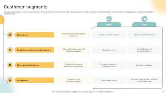 This slide showcases the needs and pains of various targeted customer segments to tailor offerings and features. It includes customers such as consumers, small and medium-sized businesses, educational institutions, and enterprises. Want to ace your presentation in front of a live audience Our Customer Segments Pc Manufacturing Company Business Model BMC SS V can help you do that by engaging all the users towards you. Slidegeeks experts have put their efforts and expertise into creating these impeccable powerpoint presentations so that you can communicate your ideas clearly. Moreover, all the templates are customizable, and easy-to-edit and downloadable. Use these for both personal and commercial use. This slide showcases the needs and pains of various targeted customer segments to tailor offerings and features. It includes customers such as consumers, small and medium-sized businesses, educational institutions, and enterprises.