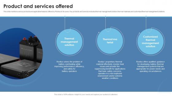 This slide mentions various products and application features offered by Rovilus to its users. Key products and services includes thermal management solution, thermal materials and customized thermal management solutions.Formulating a presentation can take up a lot of effort and time, so the content and message should always be the primary focus. The visuals of the PowerPoint can enhance the presenters message, so our Product And Services Offered Automotive Battery Manufacturer Investor Funding Elevator Pitch Deck was created to help save time. Instead of worrying about the design, the presenter can concentrate on the message while our designers work on creating the ideal templates for whatever situation is needed. Slidegeeks has experts for everything from amazing designs to valuable content, we have put everything into Product And Services Offered Automotive Battery Manufacturer Investor Funding Elevator Pitch Deck. This slide mentions various products and application features offered by Rovilus to its users. Key products and services includes thermal management solution, thermal materials and customized thermal management solutions.