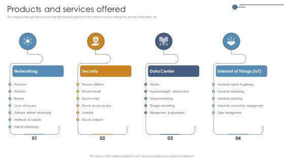 This slide provides glimpse about number of products services by the company such as networking, security, data center, etc. Coming up with a presentation necessitates that the majority of the effort goes into the content and the message you intend to convey. The visuals of a PowerPoint presentation can only be effective if it supplements and supports the story that is being told. Keeping this in mind our experts created Products And Services Offered Networking Solutions Manufacturer Investor Funding Elevator Pitch Deck to reduce the time that goes into designing the presentation. This way, you can concentrate on the message while our designers take care of providing you with the right template for the situation. This slide provides glimpse about number of products services by the company such as networking, security, data center, etc.