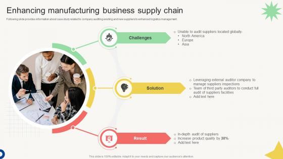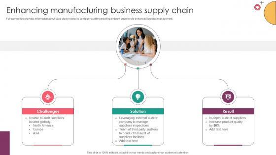 Following slide provides information about case study related to company auditing existing and new suppliers to enhanced logistics management. Present like a pro with Strategic Supplier Evaluation Enhancing Manufacturing Business Supply Chain. Create beautiful presentations together with your team, using our easy-to-use presentation slides. Share your ideas in real-time and make changes on the fly by downloading our templates. So whether you are in the office, on the go, or in a remote location, you can stay in sync with your team and present your ideas with confidence. With Slidegeeks presentation got a whole lot easier. Grab these presentations today. Following slide provides information about case study related to company auditing existing and new suppliers to enhanced logistics management.