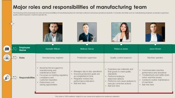 The following slide showcases key roles and responsibilities of manufacturing team to minimize confusion and ensure greater productivity. It includes elements such as manufacturing engineer, production supervisor, quality control inspector, machine operator etc. Do you know about Slidesgeeks Major Roles And Responsibilities Of Manufacturing Team Manufacturing Strategy Driving Industry 4 0 These are perfect for delivering any kind od presentation. Using it, create PowerPoint presentations that communicate your ideas and engage audiences. Save time and effort by using our pre-designed presentation templates that are perfect for a wide range of topic. Our vast selection of designs covers a range of styles, from creative to business, and are all highly customizable and easy to edit. Download as a PowerPoint template or use them as Google Slides themes. The following slide showcases key roles and responsibilities of manufacturing team to minimize confusion and ensure greater productivity. It includes elements such as manufacturing engineer, production supervisor, quality control inspector, machine operator etc.