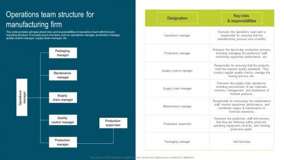 This slide provides glimpse about roles and responsibilities of operations team with the team reporting structure. It includes team members such as operations manager, production manager, quality control manager, supply chain manager, etc. Present like a pro with Operations Team Structure For Manufacturing Firm Brochure PDF Create beautiful presentations together with your team, using our easy to use presentation slides. Share your ideas in real time and make changes on the fly by downloading our templates. So whether you are in the office, on the go, or in a remote location, you can stay in sync with your team and present your ideas with confidence. With Slidegeeks presentation got a whole lot easier. Grab these presentations today.