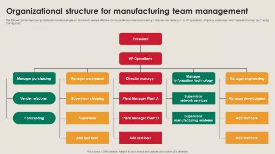 The following slide depicts organizational manufacturing team structure to ensure effective communication and decision making. It includes elements such as VP operations, shipping, warehouse, information technology, purchasing manager etc. Create an editable Organizational Structure For Manufacturing Team Manufacturing Strategy Driving Industry 4 0 that communicates your idea and engages your audience. Whether you are presenting a business or an educational presentation, pre-designed presentation templates help save time. Organizational Structure For Manufacturing Team Manufacturing Strategy Driving Industry 4 0 is highly customizable and very easy to edit, covering many different styles from creative to business presentations. Slidegeeks has creative team members who have crafted amazing templates. So, go and get them without any delay. The following slide depicts organizational manufacturing team structure to ensure effective communication and decision making. It includes elements such as VP operations, shipping, warehouse, information technology, purchasing manager etc.