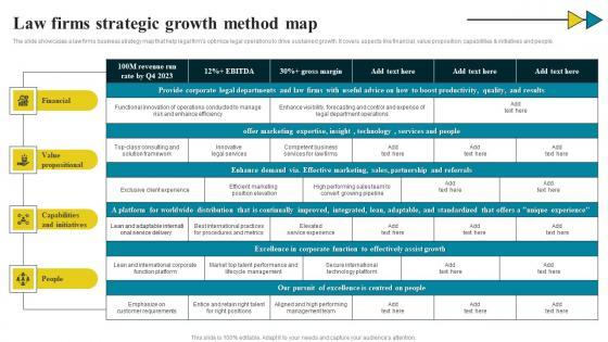 The slide showcases a law firms business strategy map that help legal firms optimize legal operations to drive sustained growth. It covers aspects like financial, value proposition, capabilities and initiatives and people. Showcasing this set of slides titled Law Firms Strategic Growth Method Map Inspiration Pdf The topics addressed in these templates are Financial, Value Propositional, Capabilities And Initiatives All the content presented in this PPT design is completely editable. Download it and make adjustments in color, background, font etc. as per your unique business setting. The slide showcases a law firms business strategy map that help legal firms optimize legal operations to drive sustained growth. It covers aspects like financial, value proposition, capabilities and initiatives and people.