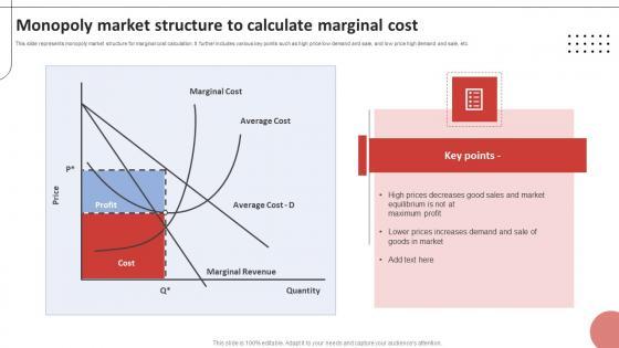 This slide represents monopoly market structure for marginal cost calculation. It further includes various key points such as high price low demand and sale, and low price high demand and sale, etc.Pitch your topic with ease and precision using this Monopoly Market Structure To Calculate Marginal Cost Information Pdf This layout presents information on Goods Market, Increases Demand, High Decreases It is also available for immediate download and adjustment. So, changes can be made in the color, design, graphics or any other component to create a unique layout. This slide represents monopoly market structure for marginal cost calculation. It further includes various key points such as high price low demand and sale, and low price high demand and sale, etc.