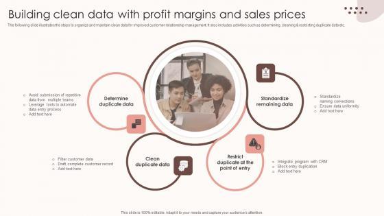 The following slide illustrates the steps to organize and maintain clean data for improved customer relationship management. It also includes activities such as determining, cleaning and restricting duplicate data etc. Create an editable Building Clean Data With Profit Margins And Sales Prices Template PDF that communicates your idea and engages your audience. Whether you are presenting a business or an educational presentation, pre designed presentation templates help save time. Building Clean Data With Profit Margins And Sales Prices Template PDF is highly customizable and very easy to edit, covering many different styles from creative to business presentations. Slidegeeks has creative team members who have crafted amazing templates. So, go and get them without any delay.