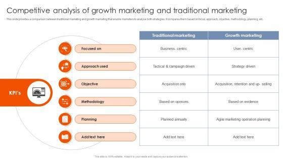 This slide provides a comparison between traditional marketing and growth marketing that enable marketers to analyse both strategies. It compares them based on focus, approach, objective, methodology, planning, etc. Are you searching for a A104 Competitive Analysis Of Growth Marketing And Traditional Marketing Best Practices MKT SS V that is uncluttered, straightforward, and original Its easy to edit, and you can change the colors to suit your personal or business branding. For a presentation that expresses how much effort you have put in, this template is ideal With all of its features, including tables, diagrams, statistics, and lists, its perfect for a business plan presentation. Make your ideas more appealing with these professional slides. Download A104 Competitive Analysis Of Growth Marketing And Traditional Marketing Best Practices MKT SS V from Slidegeeks today. This slide provides a comparison between traditional marketing and growth marketing that enable marketers to analyse both strategies. It compares them based on focus, approach, objective, methodology, planning, etc.