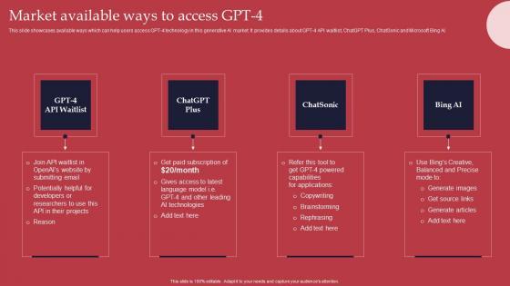 This slide showcases available ways which can help users access GPT 4 technology in this generative AI market. It provides details about GPT 4 API waitlist, ChatGPT Plus, ChatSonic and Microsoft Bing AI. This modern and well arranged Market Available Ways GPT 4 Revolutionary Generative AI Innovation Download Pdf provides lots of creative possibilities. It is very simple to customize and edit with the Powerpoint Software. Just drag and drop your pictures into the shapes. All facets of this template can be edited with Powerpoint, no extra software is necessary. Add your own material, put your images in the places assigned for them, adjust the colors, and then you can show your slides to the world, with an animated slide included. This slide showcases available ways which can help users access GPT 4 technology in this generative AI market. It provides details about GPT 4 API waitlist, ChatGPT Plus, ChatSonic and Microsoft Bing AI.