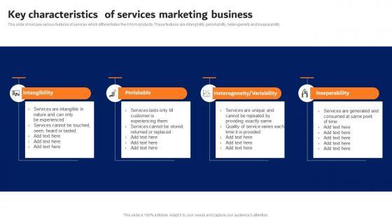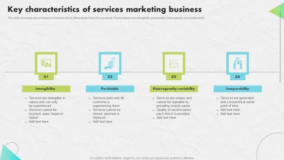 This slide showcase various features of services which differentiates them from products. These features are intangibility, perishability, heterogeneity and inseparability. Are you in need of a template that can accommodate all of your creative concepts This one is crafted professionally and can be altered to fit any style. Use it with Google Slides or PowerPoint. Include striking photographs, symbols, depictions, and other visuals. Fill, move around, or remove text boxes as desired. Test out color palettes and font mixtures. Edit and save your work, or work with colleagues. Download Service Promotion Plan Key Characteristics Of Services Marketing Business Designs PDF and observe how to make your presentation outstanding. Give an impeccable presentation to your group and make your presentation unforgettable.