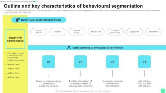 The following slide illustrates brief overview of behavioral segmentation along with some traits to formulate smart strategies and expand customer base. It includes elements such as purchase behavior, occasion, customer journey stage, engagement, loyal consumer etc. Boost your pitch with our creative Outline And Key Characteristics Introduction To Niche Marketing Audience Segmentation Designs Pdf. Deliver an awe inspiring pitch that will mesmerize everyone. Using these presentation templates you will surely catch everyones attention. You can browse the ppts collection on our website. We have researchers who are experts at creating the right content for the templates. So you do not have to invest time in any additional work. Just grab the template now and use them. The following slide illustrates brief overview of behavioral segmentation along with some traits to formulate smart strategies and expand customer base. It includes elements such as purchase behavior, occasion, customer journey stage, engagement, loyal consumer etc.