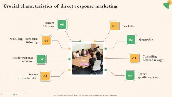 Formulating a presentation can take up a lot of effort and time, so the content and message should always be the primary focus. The visuals of the PowerPoint can enhance the presenters message, so our Direct Response Marketing Guide Ultimate Success Crucial Characteristics Of Direct Designs PDF was created to help save time. Instead of worrying about the design, the presenter can concentrate on the message while our designers work on creating the ideal templates for whatever situation is needed. Slidegeeks has experts for everything from amazing designs to valuable content, we have put everything into Direct Response Marketing Guide Ultimate Success Crucial Characteristics Of Direct Designs PDF