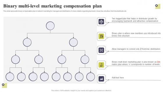 This slide represents binary compensation plan in network marketing for managers and distributors. It covers details regarding teamwork, binary tree structure, front line distributor etc. Are you in need of a template that can accommodate all of your creative concepts This one is crafted professionally and can be altered to fit any style. Use it with Google Slides or PowerPoint. Include striking photographs, symbols, depictions, and other visuals. Fill, move around, or remove text boxes as desired. Test out color palettes and font mixtures. Edit and save your work, or work with colleagues. Download Comprehensive Guide For Multi Level Binary Multi Level Marketing Compensation Plan Template PDF and observe how to make your presentation outstanding. Give an impeccable presentation to your group and make your presentation unforgettable.