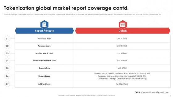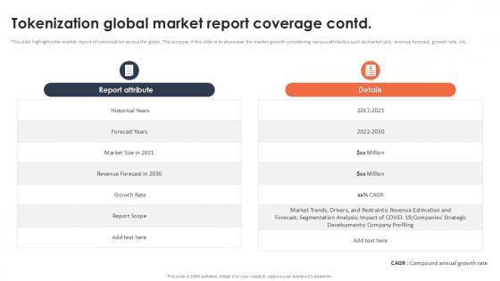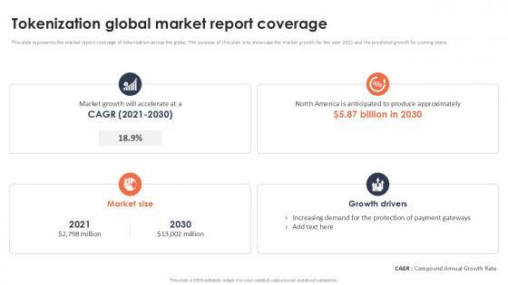 This slide represents the market report coverage of tokenization across the globe. The purpose of this slide is to showcase the market growth for the year 2021 and the predicted growth for coming years. Find a pre-designed and impeccable Tokenization Global Market Report Coverage PPT Example. The templates can ace your presentation without additional effort. You can download these easy-to-edit presentation templates to make your presentation stand out from others. So, what are you waiting for Download the template from Slidegeeks today and give a unique touch to your presentation. This slide represents the market report coverage of tokenization across the globe. The purpose of this slide is to showcase the market growth for the year 2021 and the predicted growth for coming years.