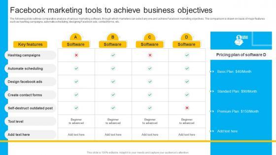 The following slide outlines comparative analysis of various marketing software, through which marketers can select any one and achieve Facebook marketing objectives. The comparison is drawn on basis of major features such as hashtag campaigns, automate scheduling, designing Facebook ads, contact forms, etc. Coming up with a presentation necessitates that the majority of the effort goes into the content and the message you intend to convey. The visuals of a PowerPoint presentation can only be effective if it supplements and supports the story that is being told. Keeping this in mind our experts created How To Create Cost Effective Facebook Marketing Tools To Achieve Strategy SS V to reduce the time that goes into designing the presentation. This way, you can concentrate on the message while our designers take care of providing you with the right template for the situation. The following slide outlines comparative analysis of various marketing software, through which marketers can select any one and achieve Facebook marketing objectives. The comparison is drawn on basis of major features such as hashtag campaigns, automate scheduling, designing Facebook ads, contact forms, etc.