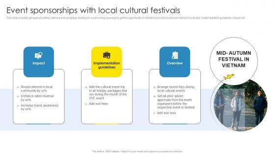 This slide provides glimpse about the cultural event campaign strategy for each holiday package to get the opportunity of advertising to build customer interest. It includes, implementation guidelines, impact, etc. Formulating a presentation can take up a lot of effort and time, so the content and message should always be the primary focus. The visuals of the PowerPoint can enhance the presenters message, so our Strategic Marketing Plan Event Sponsorships With Local Cultural Festivals Download Pdf was created to help save time. Instead of worrying about the design, the presenter can concentrate on the message while our designers work on creating the ideal templates for whatever situation is needed. Slidegeeks has experts for everything from amazing designs to valuable content, we have put everything into Strategic Marketing Plan Event Sponsorships With Local Cultural Festivals Download Pdf. This slide provides glimpse about the cultural event campaign strategy for each holiday package to get the opportunity of advertising to build customer interest. It includes, implementation guidelines, impact, etc.