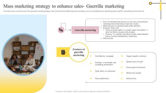 This slide covers a brief overview of the guerrilla marketing strategy. It also provides the benefits of guerrilla marketing, such as cost-effectiveness, attracting people, high ROI, spreading word of mouth, etc. Are you in need of a template that can accommodate all of your creative concepts This one is crafted professionally and can be altered to fit any style. Use it with Google Slides or PowerPoint. Include striking photographs, symbols, depictions, and other visuals. Fill, move around, or remove text boxes as desired. Test out color palettes and font mixtures. Edit and save your work, or work with colleagues. Download Guide On Mass Advertising Mass Marketing Strategy To Enhance Sales Definitive Structure Pdf and observe how to make your presentation outstanding. Give an impeccable presentation to your group and make your presentation unforgettable. This slide covers a brief overview of the guerrilla marketing strategy. It also provides the benefits of guerrilla marketing, such as cost-effectiveness, attracting people, high ROI, spreading word of mouth, etc.