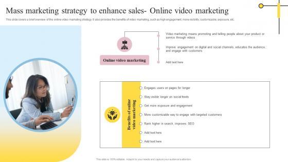 This slide covers a brief overview of the online video marketing strategy. It also provides the benefits of video marketing, such as high engagement, more visibility, customizable, exposure, etc. Formulating a presentation can take up a lot of effort and time, so the content and message should always be the primary focus. The visuals of the PowerPoint can enhance the presenters message, so our Mass Marketing Strategy To Enhance Sales Online Definitive Guide On Mass Advertising Formats Pdf was created to help save time. Instead of worrying about the design, the presenter can concentrate on the message while our designers work on creating the ideal templates for whatever situation is needed. Slidegeeks has experts for everything from amazing designs to valuable content, we have put everything into Mass Marketing Strategy To Enhance Sales Online Definitive Guide On Mass Advertising Formats Pdf This slide covers a brief overview of the online video marketing strategy. It also provides the benefits of video marketing, such as high engagement, more visibility, customizable, exposure, etc.