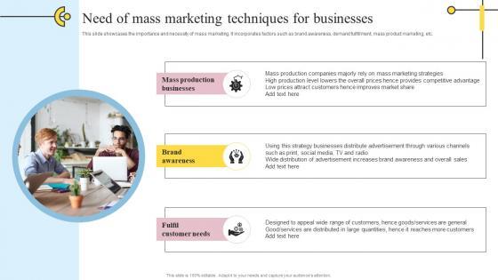 This slide showcases the importance and necessity of mass marketing. It incorporates factors such as brand awareness, demand fulfillment, mass product marketing, etc. This modern and well-arranged Need Of Mass Marketing Techniques Definitive Guide On Mass Advertising Professional Pdf provides lots of creative possibilities. It is very simple to customize and edit with the Powerpoint Software. Just drag and drop your pictures into the shapes. All facets of this template can be edited with Powerpoint no extra software is necessary. Add your own material, put your images in the places assigned for them, adjust the colors, and then you can show your slides to the world, with an animated slide included. This slide showcases the importance and necessity of mass marketing. It incorporates factors such as brand awareness, demand fulfillment, mass product marketing, etc.