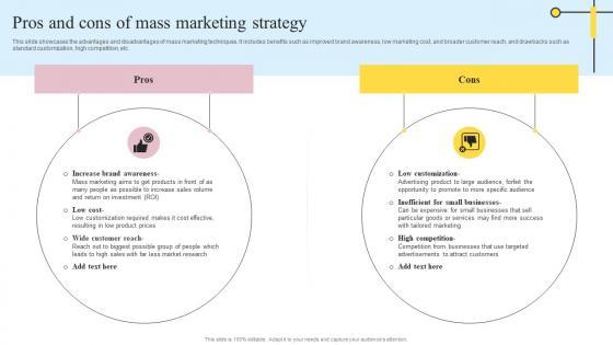 This slide showcases the advantages and disadvantages of mass marketing techniques. It includes benefits such as improved brand awareness, low marketing cost, and broader customer reach, and drawbacks such as standard customization, high competition, etc. The best PPT templates are a great way to save time, energy, and resources. Slidegeeks have 100 percent editable powerpoint slides making them incredibly versatile. With these quality presentation templates, you can create a captivating and memorable presentation by combining visually appealing slides and effectively communicating your message. Download Pros And Cons Of Mass Marketing Strategy Definitive Guide On Mass Advertising Microsoft Pdf from Slidegeeks and deliver a wonderful presentation. This slide showcases the advantages and disadvantages of mass marketing techniques. It includes benefits such as improved brand awareness, low marketing cost, and broader customer reach, and drawbacks such as standard customization, high competition, etc.