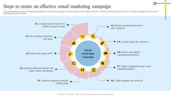 This slide illustrates the process of developing an effective email marketing campaign. It includes market research, setting an objective, creating a landing page, lead conversion, monitoring campaign performance, and developing a targeted email list. Retrieve professionally designed Steps To Create An Effective Email Marketing Definitive Guide On Mass Advertising Themes Pdf to effectively convey your message and captivate your listeners. Save time by selecting pre-made slideshows that are appropriate for various topics, from business to educational purposes. These themes come in many different styles, from creative to corporate, and all of them are easily adjustable and can be edited quickly. Access them as PowerPoint templates or as Google Slides themes. You do not have to go on a hunt for the perfect presentation because Slidegeeks got you covered from everywhere. This slide illustrates the process of developing an effective email marketing campaign. It includes market research, setting an objective, creating a landing page, lead conversion, monitoring campaign performance, and developing a targeted email list.