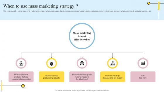 This slide covers the primary reason for implementing mass marketing techniques. It includes reasons such as mass production products promotion, high product demand marketing, commodity products marketing, etc. Here you can discover an assortment of the finest PowerPoint and Google Slides templates. With these templates, you can create presentations for a variety of purposes while simultaneously providing your audience with an eye-catching visual experience. Download When To Use Mass Marketing Strategy Definitive Guide On Mass Advertising Microsoft Pdf to deliver an impeccable presentation. These templates will make your job of preparing presentations much quicker, yet still, maintain a high level of quality. Slidegeeks has experienced researchers who prepare these templates and write high-quality content for you. Later on, you can personalize the content by editing the When To Use Mass Marketing Strategy Definitive Guide On Mass Advertising Microsoft Pdf. This slide covers the primary reason for implementing mass marketing techniques. It includes reasons such as mass production products promotion, high product demand marketing, commodity products marketing, etc.