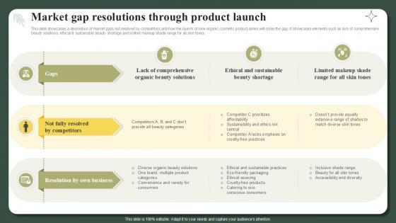 This slide showcases a description of market gaps not resolved by competitors and how the launch of new organic cosmetic product series will close the gap. It showcases elements such as lack of comprehensive beauty solutions, ethical and sustainable beauty shortage and limited makeup shade range for all skin tones. Take your projects to the next level with our ultimate collection of Market Gap Resolutions Through Product Launch Successful Launch Ppt Slide Slidegeeks has designed a range of layouts that are perfect for representing task or activity duration, keeping track of all your deadlines at a glance. Tailor these designs to your exact needs and give them a truly corporate look with your own brand colors they will make your projects stand out from the rest This slide showcases a description of market gaps not resolved by competitors and how the launch of new organic cosmetic product series will close the gap. It showcases elements such as lack of comprehensive beauty solutions, ethical and sustainable beauty shortage and limited makeup shade range for all skin tones.