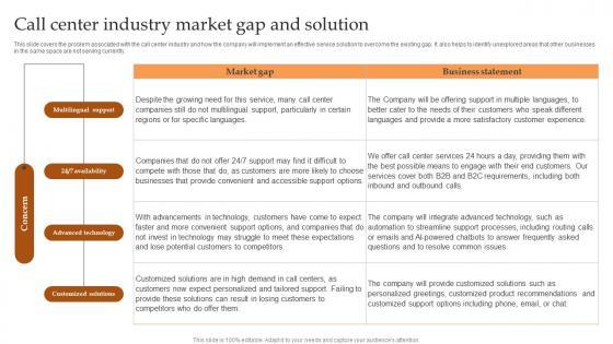 This slide covers the problem associated with the call center industry and how the company will implement an effective service solution to overcome the existing gap. It also helps to identify unexplored areas that other businesses in the same space are not serving currently. Present like a pro with Call Center Industry Market Gap And Solution BPO Center Business Plan Summary Pdf Create beautiful presentations together with your team, using our easy-to-use presentation slides. Share your ideas in real-time and make changes on the fly by downloading our templates. So whether you are in the office, on the go, or in a remote location, you can stay in sync with your team and present your ideas with confidence. With Slidegeeks presentation got a whole lot easier. Grab these presentations today. This slide covers the problem associated with the call center industry and how the company will implement an effective service solution to overcome the existing gap. It also helps to identify unexplored areas that other businesses in the same space are not serving currently.