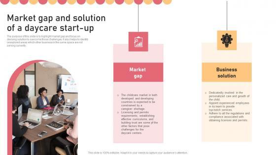 The purpose of this slide is to highlight market gap and focus on devising solution to overcome those challenges. It also helps to identify unexplored areas which other business in the same space are not serving currently. Want to ace your presentation in front of a live audience Our Market Gap And Solution Of A Daycare Start Up Pictures PDF can help you do that by engaging all the users towards you.. Slidegeeks experts have put their efforts and expertise into creating these impeccable powerpoint presentations so that you can communicate your ideas clearly. Moreover, all the templates are customizable, and easy-to-edit and downloadable. Use these for both personal and commercial use.
