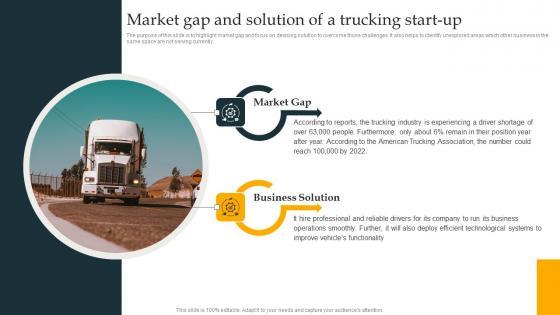 The purpose of this slide is to highlight market gap and focus on devising solution to overcome those challenges. It also helps to identify unexplored areas which other business in the same space are not serving currently.This modern and well-arranged Market Gap And Solution Of A Trucking Start Up Freight Trucking Business Plan Formats Pdf provides lots of creative possibilities. It is very simple to customize and edit with the Powerpoint Software. Just drag and drop your pictures into the shapes. All facets of this template can be edited with Powerpoint no extra software is necessary. Add your own material, put your images in the places assigned for them, adjust the colors, and then you can show your slides to the world, with an animated slide included. The purpose of this slide is to highlight market gap and focus on devising solution to overcome those challenges. It also helps to identify unexplored areas which other business in the same space are not serving currently.