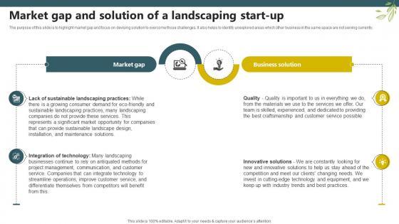 The purpose of this slide is to highlight market gap and focus on devising solution to overcome those challenges. It also helps to identify unexplored areas which other business in the same space are not serving currently. Welcome to our selection of the Market Gap And Solution Of A Landscaping Start Up Lawn Care BP SS V. These are designed to help you showcase your creativity and bring your sphere to life. Planning and Innovation are essential for any business that is just starting out. This collection contains the designs that you need for your everyday presentations. All of our PowerPoints are 100Percent editable, so you can customize them to suit your needs. This multi-purpose template can be used in various situations. Grab these presentation templates today. The purpose of this slide is to highlight market gap and focus on devising solution to overcome those challenges. It also helps to identify unexplored areas which other business in the same space are not serving currently.