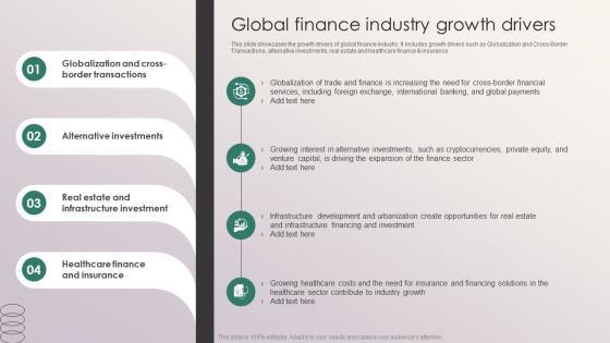 This slide showcases the growth drivers of global finance industry. It includes growth drivers such as Globalization and Cross Border Transactions, alternative investments, real estate and healthcare finance and insurance. Whether you have daily or monthly meetings, a brilliant presentation is necessary. Global Finance Industry Growth Drivers Penetrating Markets With Financial Strategy SS V can be your best option for delivering a presentation. Represent everything in detail using Global Finance Industry Growth Drivers Penetrating Markets With Financial Strategy SS V and make yourself stand out in meetings. The template is versatile and follows a structure that will cater to your requirements. All the templates prepared by Slidegeeks are easy to download and edit. Our research experts have taken care of the corporate themes as well. So, give it a try and see the results. This slide showcases the growth drivers of global finance industry. It includes growth drivers such as Globalization and Cross Border Transactions, alternative investments, real estate and healthcare finance and insurance.