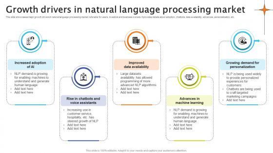 This slide showcases major growth drivers in natural language processing market referable for users, investors and business owners. It provides details about adoption, chatbots, data availability, advances, personalization, etc. Make sure to capture your audiences attention in your business displays with our gratis customizable Growth Drivers In Natural Language Processing Market Crafting Interactions A Guide AI SS V. These are great for business strategies, office conferences, capital raising or task suggestions. If you desire to acquire more customers for your tech business and ensure they stay satisfied, create your own sales presentation with these plain slides. This slide showcases major growth drivers in natural language processing market referable for users, investors and business owners. It provides details about adoption, chatbots, data availability, advances, personalization, etc.