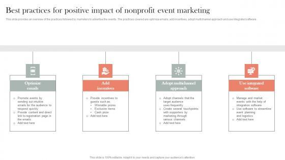 This slide provides an overview of the practices followed by marketers to advertise the events. The practices covered are optimize emails, add incentives, adopt multichannel approach and use integrated software.Want to ace your presentation in front of a live audience Our Best Practices For Positive Impact Of Nonprofit Marketing Efficient Nonprofit Marketing can help you do that by engaging all the users towards you.. Slidegeeks experts have put their efforts and expertise into creating these impeccable powerpoint presentations so that you can communicate your ideas clearly. Moreover, all the templates are customizable, and easy-to-edit and downloadable. Use these for both personal and commercial use. This slide provides an overview of the practices followed by marketers to advertise the events. The practices covered are optimize emails, add incentives, adopt multichannel approach and use integrated software.