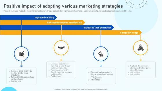 This slide showcases the positive impact of implementing marketing approaches that are improved visibility, enhanced customer relationship, increased lead generation and competitive edge. Presenting this PowerPoint presentation, titled Digital Marketing Strategies Positive Impact Of Adopting Various Marketing Strategies SA SS V, with topics curated by our researchers after extensive research. This editable presentation is available for immediate download and provides attractive features when used. Download now and captivate your audience. Presenting this Digital Marketing Strategies Positive Impact Of Adopting Various Marketing Strategies SA SS V. Our researchers have carefully researched and created these slides with all aspects taken into consideration. This is a completely customizable Digital Marketing Strategies Positive Impact Of Adopting Various Marketing Strategies SA SS V that is available for immediate downloading. Download now and make an impact on your audience. Highlight the attractive features available with our PPTs. This slide showcases the positive impact of implementing marketing approaches that are improved visibility, enhanced customer relationship, increased lead generation and competitive edge.