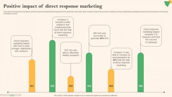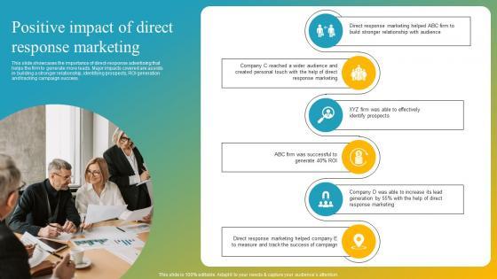 This slide showcases the importance of direct-response advertising that helps the firm to generate more leads. Major impacts covered are assists in building a stronger relationship, identifying prospects, ROI generation and tracking campaign success. Present like a pro with Direct Response Marketing Guide Ultimate Success Positive Impact Of Direct Response Demonstration PDF Create beautiful presentations together with your team, using our easy-to-use presentation slides. Share your ideas in real-time and make changes on the fly by downloading our templates. So whether you are in the office, on the go, or in a remote location, you can stay in sync with your team and present your ideas with confidence. With Slidegeeks presentation got a whole lot easier. Grab these presentations today.
