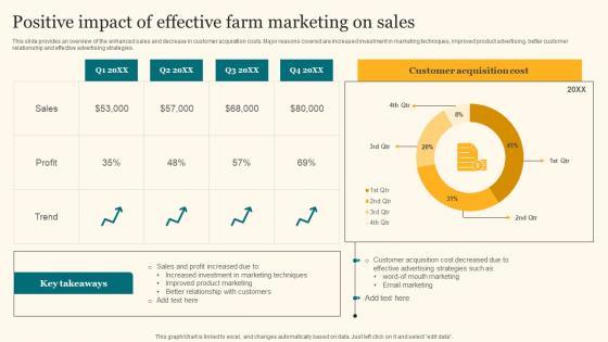 This slide provides an overview of the enhanced sales and decrease in customer acquisition costs. Major reasons covered are increased investment in marketing techniques, improved product advertising, better customer relationship and effective advertising strategies. Create an editable Positive Impact Of Effective Farm Marketing On Agricultural Product Promotion Demonstration Pdf that communicates your idea and engages your audience. Whether you are presenting a business or an educational presentation, pre-designed presentation templates help save time. Positive Impact Of Effective Farm Marketing On Agricultural Product Promotion Demonstration Pdf is highly customizable and very easy to edit, covering many different styles from creative to business presentations. Slidegeeks has creative team members who have crafted amazing templates. So, go and get them without any delay. This slide provides an overview of the enhanced sales and decrease in customer acquisition costs. Major reasons covered are increased investment in marketing techniques, improved product advertising, better customer relationship and effective advertising strategies.