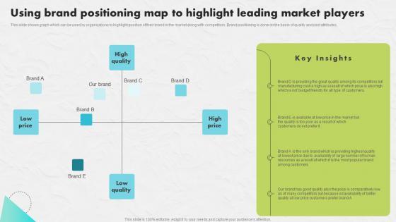 This slide shows graph which can be used by organizations to highlight position of their brand in the market along with competitors. Brand positioning is done on the basis of quality and cost attributes. Boost your pitch with our creative Using Brand Positioning Map Developing An Impactful SEO Marketing Plan Inspiration Pdf. Deliver an awe inspiring pitch that will mesmerize everyone. Using these presentation templates you will surely catch everyones attention. You can browse the ppts collection on our website. We have researchers who are experts at creating the right content for the templates. So you do not have to invest time in any additional work. Just grab the template now and use them. This slide shows graph which can be used by organizations to highlight position of their brand in the market along with competitors. Brand positioning is done on the basis of quality and cost attributes.