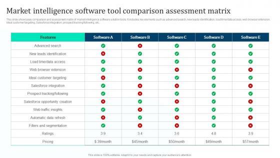 This slide showcases comparison and assessment matrix of market intelligence software solution tools. It includes key elements such as advanced search, new leads identification, load time data access, web browser extension, ideal customer targeting, Salesforce integration, prospect tracking following, etc. Retrieve professionally designed Strategic Market Insight Implementation Guide Market Intelligence Software Tool Comparison Assessment Professional PDF to effectively convey your message and captivate your listeners. Save time by selecting pre made slideshows that are appropriate for various topics, from business to educational purposes. These themes come in many different styles, from creative to corporate, and all of them are easily adjustable and can be edited quickly. Access them as PowerPoint templates or as Google Slides themes. You do not have to go on a hunt for the perfect presentation because Slidegeeks got you covered from everywhere.