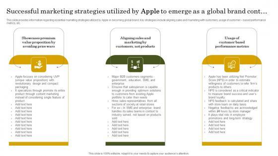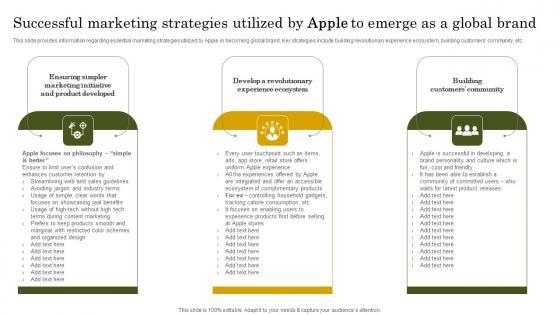 This slide provides information regarding essential marketing strategies utilized by Apple in becoming global brand. Key strategies include building revolutionary experience ecosystem, building customers community, etc. Create an editable Successful Marketing Strategies Utilized Apple Branding Strategy To Become Market Leader Mockup Pdf that communicates your idea and engages your audience. Whether you are presenting a business or an educational presentation, pre designed presentation templates help save time. Successful Marketing Strategies Utilized Apple Branding Strategy To Become Market Leader Mockup Pdf is highly customizable and very easy to edit, covering many different styles from creative to business presentations. Slidegeeks has creative team members who have crafted amazing templates. So, go and get them without any delay. This slide provides information regarding essential marketing strategies utilized by Apple in becoming global brand. Key strategies include building revolutionary experience ecosystem, building customers community, etc.