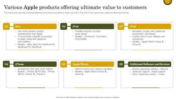 This slide provides information regarding different products and services offered by Apple such as Mac, iPod, iPad, iPhone, Apple Watch, additional software and services. There are so many reasons you need a Various Apple Products Offering Apple Branding Strategy To Become Market Leader Professional Pdf. The first reason is you can not spend time making everything from scratch, Thus, Slidegeeks has made presentation templates for you too. You can easily download these templates from our website easily. This slide provides information regarding different products and services offered by Apple such as Mac, iPod, iPad, iPhone, Apple Watch, additional software and services.