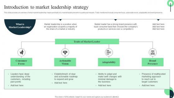 This slide provides an overview of what market leadership means and traits of a market leader present in a particular industry. Traits mentioned include consumer focus, actionable vision, adaptability and brand presence. Make sure to capture your audiences attention in your business displays with our gratis customizable Market Leaders Guide To Influence Introduction To Market Leadership Strategy Themes Pdf. These are great for business strategies, office conferences, capital raising or task suggestions. If you desire to acquire more customers for your tech business and ensure they stay satisfied, create your own sales presentation with these plain slides. This slide provides an overview of what market leadership means and traits of a market leader present in a particular industry. Traits mentioned include consumer focus, actionable vision, adaptability and brand presence.