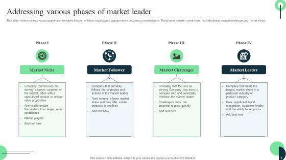 This slide mentions the various phases that are involved through which an organization passes before becoming a market leader. The phases include market niche, market follower, market challenger and market leader. Slidegeeks is one of the best resources for PowerPoint templates. You can download easily and regulate Market Leaders Guide To Influence Addressing Various Phases Of Market Leader Diagrams Pdf for your personal presentations from our wonderful collection. A few clicks is all it takes to discover and get the most relevant and appropriate templates. Use our Templates to add a unique zing and appeal to your presentation and meetings. All the slides are easy to edit and you can use them even for advertisement purposes. This slide mentions the various phases that are involved through which an organization passes before becoming a market leader. The phases include market niche, market follower, market challenger and market leader.