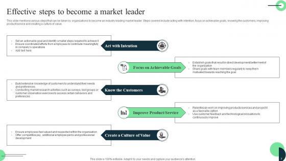 This slide mentions various steps that can be taken by organizations to become an industry leading market leader. Steps covered include acting with intention, focus on achievable goals, knowing the customers, improving product or service and creating a culture of value. Find highly impressive Market Leaders Guide To Influence Effective Steps To Become A Market Leader Topics Pdf on Slidegeeks to deliver a meaningful presentation. You can save an ample amount of time using these presentation templates. No need to worry to prepare everything from scratch because Slidegeeks experts have already done a huge research and work for you. You need to download Market Leaders Guide To Influence Effective Steps To Become A Market Leader Topics Pdf for your upcoming presentation. All the presentation templates are 100 percent editable and you can change the color and personalize the content accordingly. Download now. This slide mentions various steps that can be taken by organizations to become an industry leading market leader. Steps covered include acting with intention, focus on achievable goals, knowing the customers, improving product or service and creating a culture of value.