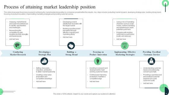 This slide showcases the process involved in achieving the market leadership position by companies present within the industry. Key steps include conducting market research, developing strategic plan, building strong brand, focusing on product innovation, implementing marketing strategies and providing customer service. The Market Leaders Guide To Influence Process Of Attaining Market Leadership Position Designs Pdf is a compilation of the most recent design trends as a series of slides. It is suitable for any subject or industry presentation, containing attractive visuals and photo spots for businesses to clearly express their messages. This template contains a variety of slides for the user to input data, such as structures to contrast two elements, bullet points, and slides for written information. Slidegeeks is prepared to create an impression. This slide showcases the process involved in achieving the market leadership position by companies present within the industry. Key steps include conducting market research, developing strategic plan, building strong brand, focusing on product innovation, implementing marketing strategies and providing customer service.