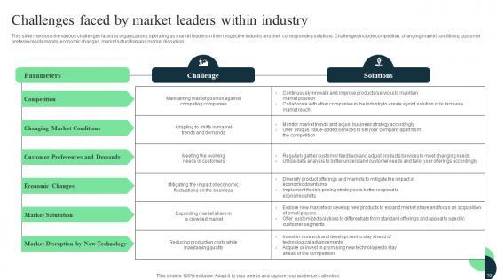 This slide mentions the various challenges faced by organizations operating as market leaders in their respective industry and their corresponding solutions. Challenges include competition, changing market conditions, customer preferences or demands, economic changes, market saturation and market disruption. From laying roadmaps to briefing everything in detail, our templates are perfect for you. You can set the stage with your presentation slides. All you have to do is download these easy-to-edit and customizable templates. Market Leaders Guide To Influence Challenges Faced By Market Leaders Within Industry Formats Pdf will help you deliver an outstanding performance that everyone would remember and praise you for. Do download this presentation today. This slide mentions the various challenges faced by organizations operating as market leaders in their respective industry and their corresponding solutions. Challenges include competition, changing market conditions, customer preferences or demands, economic changes, market saturation and market disruption.