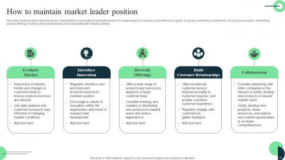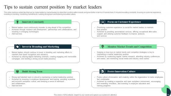 This slide mentions various tips that can be implemented by organizations having the position of market leaders to maintain a hold within the industry. It includes monitoring market trends, focusing on innovation, diversifying product offerings, fostering strong relationships and collaborating with industry partners. If you are looking for a format to display your unique thoughts, then the professionally designed Market Leaders Guide To Influence How To Maintain Market Leader Position Rules Pdf is the one for you. You can use it as a Google Slides template or a PowerPoint template. Incorporate impressive visuals, symbols, images, and other charts. Modify or reorganize the text boxes as you desire. Experiment with shade schemes and font pairings. Alter, share or cooperate with other people on your work. Download Market Leaders Guide To Influence How To Maintain Market Leader Position Rules Pdf and find out how to give a successful presentation. Present a perfect display to your team and make your presentation unforgettable. This slide mentions various tips that can be implemented by organizations having the position of market leaders to maintain a hold within the industry. It includes monitoring market trends, focusing on innovation, diversifying product offerings, fostering strong relationships and collaborating with industry partners.